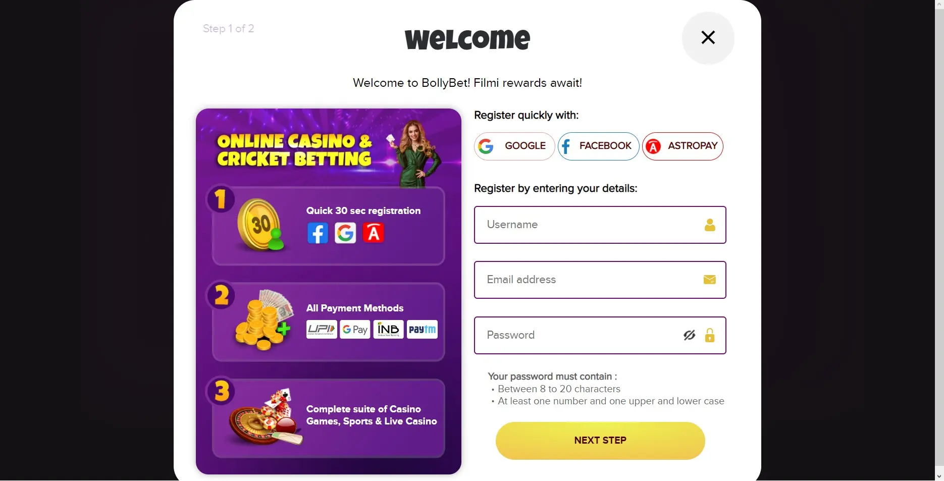 2. You can register using your Google, Facebook, or AstroPay account by clicking on the respective option. You can also register by entering your username, email address, and password.