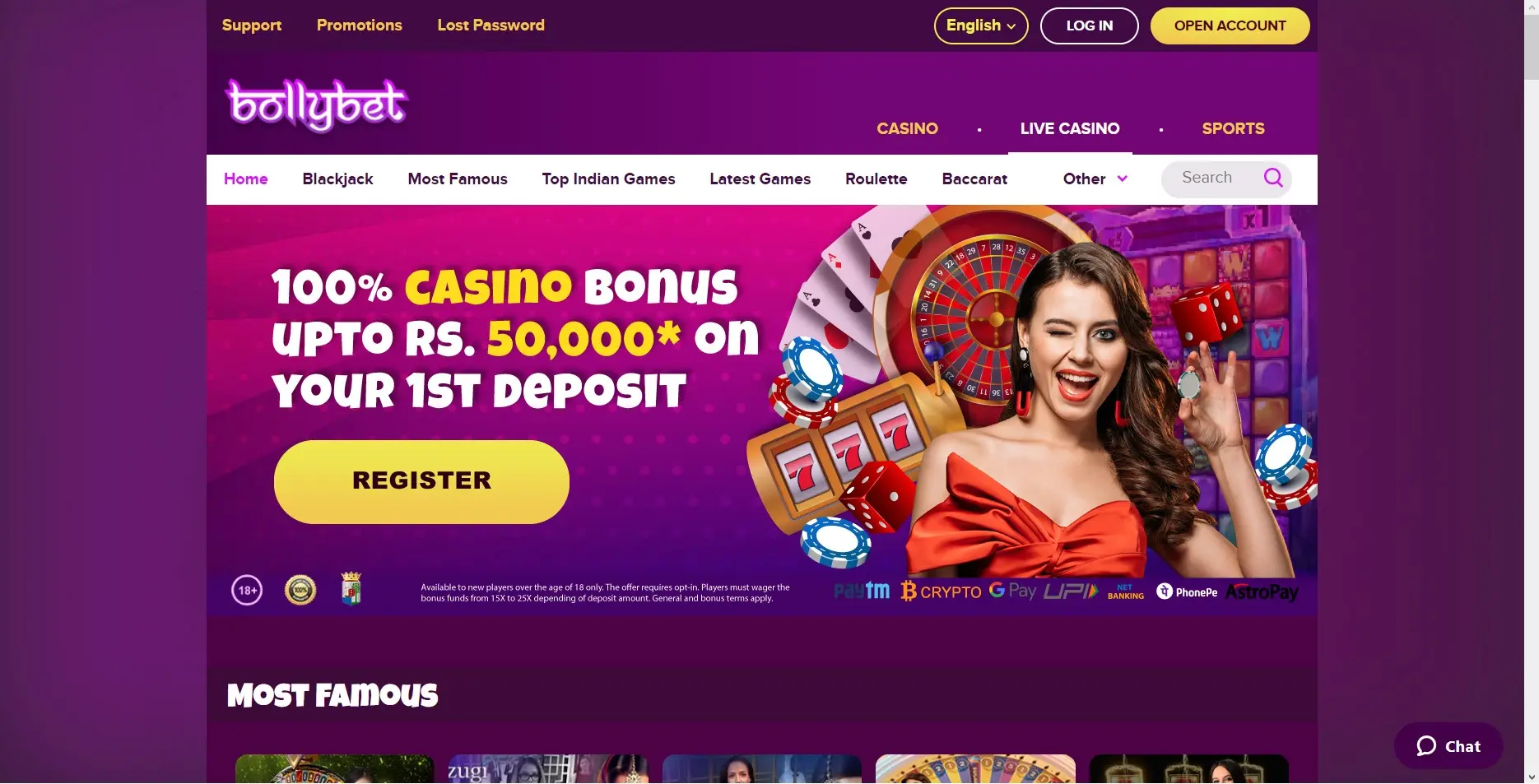Double your first deposit at Bollybet. Enjoy a 100% match bonus of up to ₹50,000. To claim the bonus, you have to use the code Casino_Bonus. With the bonus, you can play all the Bollybet casino online games.