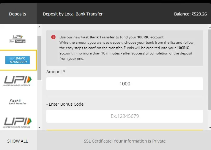 Transferring the money into your bank transfer casino's wallet will require a UPI casino transfer or net banking option. Visit your casino dashboard or banking page, click on deposit and choose net banking as the preferred option. Enter the amount and required information where necessary and click on deposit. This will redirect you to your bank provider page where you will finish up the transaction.
