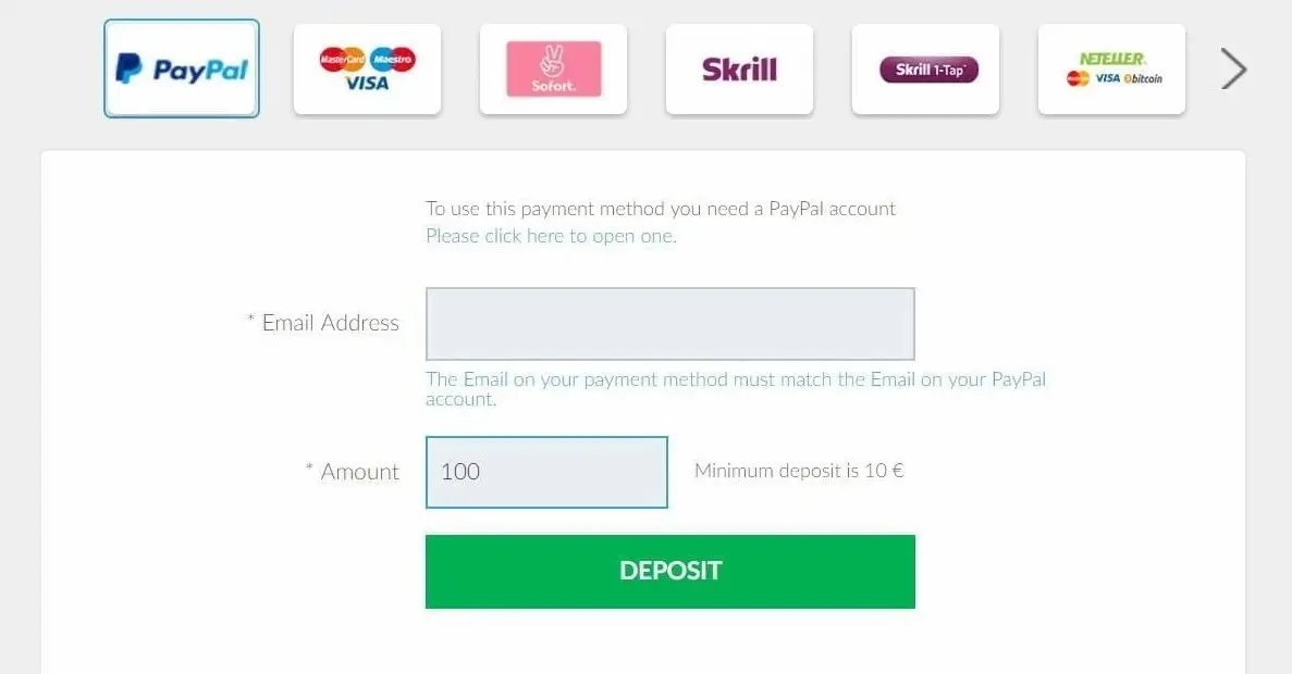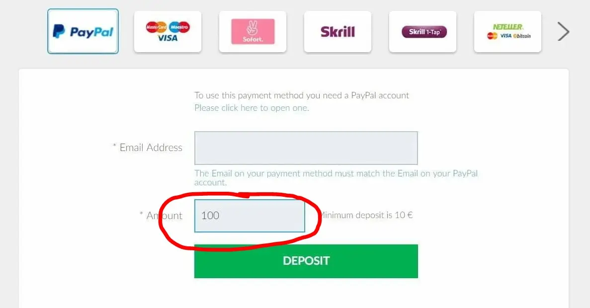 3. Choose PayPal as the Deposit Method