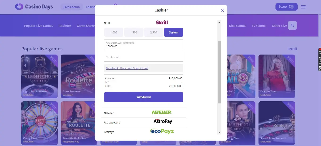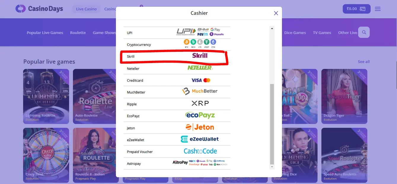 After one registers at any of the Skrill casinos in India they can choose to make payment using this digital wallet platform. Best Skrill Casinos are PureWin, Betway and Casino Days among others.
