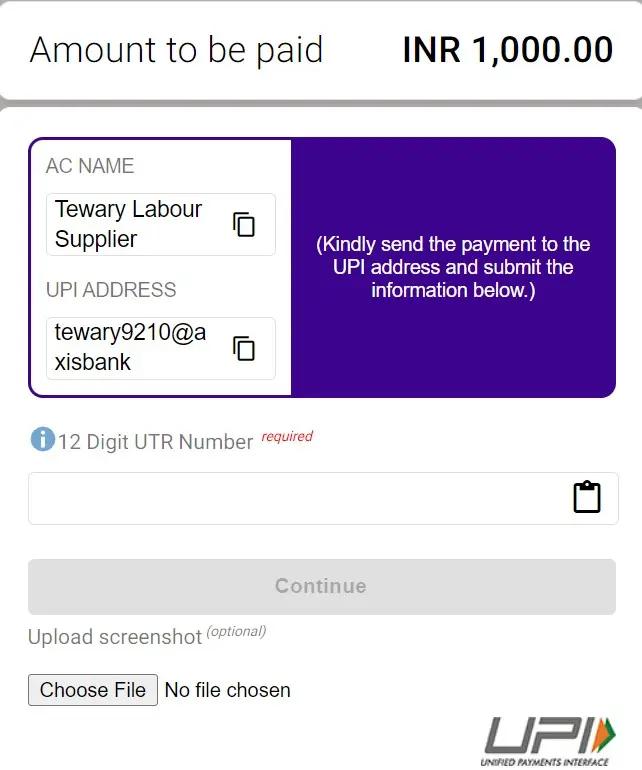 The payment method should be UPI. Your UPI ID must be entered and confirmed on this page.